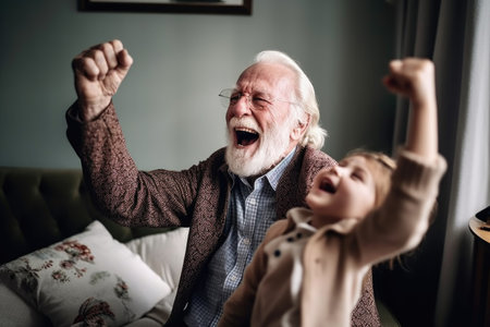 shot of a grandpa cheering while spending time with his granddaughter at home, created with generative ai