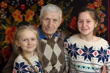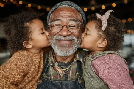 Elderly man with gray beard is surrounded by two children, both smiling and showing affection, creating a warm family atmosphere.
