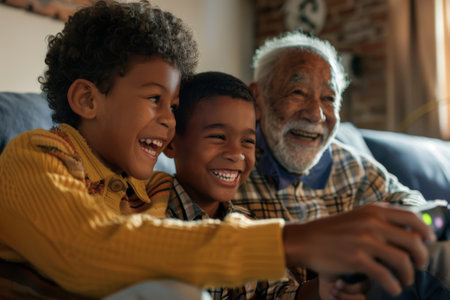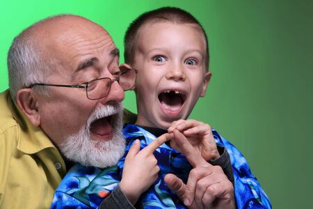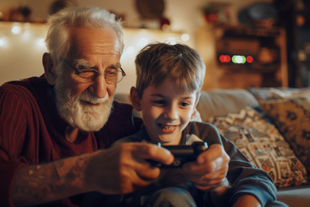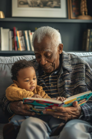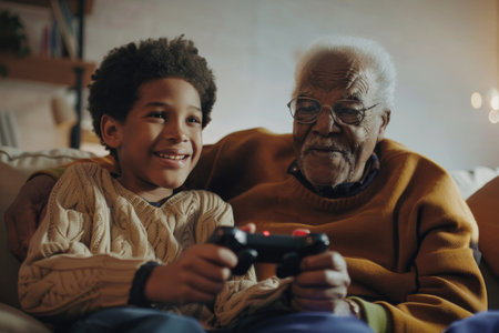 A heartwarming portrait depicting a senior man and young boy, demonstrating family connection against a dark background. A.I.