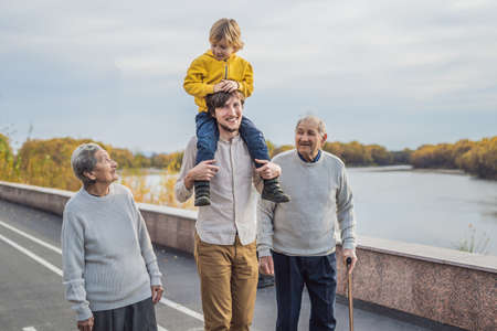 An elderly couple walks in the park with a river with their grandson and great-grandson.