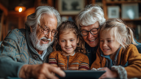 Grandparents with grandchildren sitting on sofa and using digital tablet at home