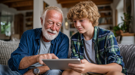 Grandfather and grandson using digital tablet while sitting on sofa at home