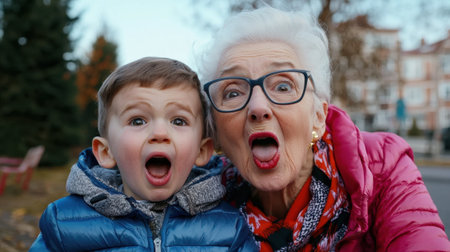 A young boy and an older woman are posing for a picture. The woman is wearing glasses and has her mouth open, while the boy is looking at the camera. The scene has a lighthearted and playful mood