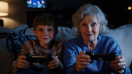 A young boy and an older woman are playing a video game together. The boy is holding a controller in his right hand, while the woman is holding one in her left hand. They are both smiling