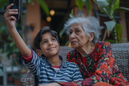 A young boy and an elderly woman are sitting together, with the boy taking a picture of the woman with his cell phone. Concept of warmth and connection between the two generations