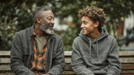 A grandfather and grandson share a warm conversation on a park bench, surrounded by trees with colorful autumn leaves. The atmosphere is joyful and relaxed, with smiles exchanged.