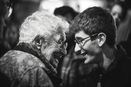 A black and white portrait captures a heartwarming moment between an elderly woman and a young man, both smiling and connecting in a public setting.