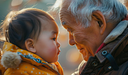 Tender moment between elderly Asian grandfather and toddler grandchild