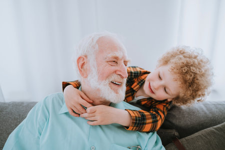 Loving embrace between a wise grandfather with glasses and his young granddaughter in warm sunlight
