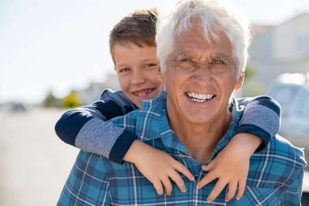 Grandfather carrying grandson for a piggyback ride in teh neighborhood. Happy senior man smiling while piggybacking his cute grandson. Senior man having fun with his grandchild outdoor.