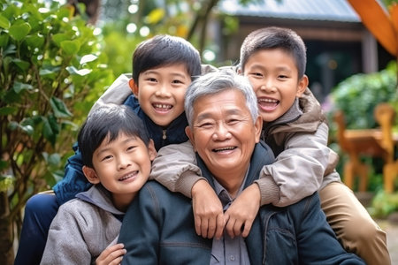 Meeting of grandfather and grandchildren. An elderly Asian man and his grandchildren are happy together. They hug and rejoice at meeting each other. Caring for the elderly. Children visit old people