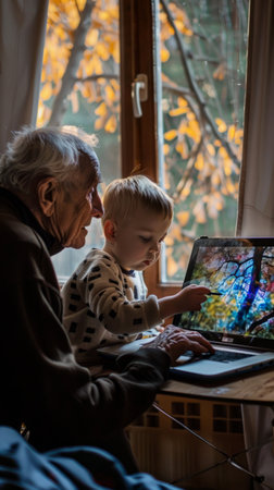 Elderly man with a gray beard and young boy with curly hair are sharing a moment while looking at a laptop screen, fostering connection and learning together
