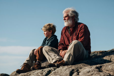 Grandfather and grandson are sitting on a rock, enjoying a scenic view from the top of a mountain