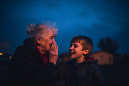 Happy grandmother whispering secrets into the ear of her laughing grandson, creating joyful moments together outdoors at dusk