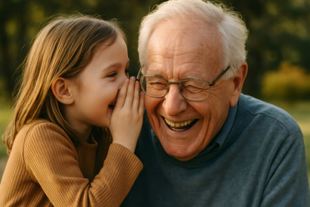 Granddaughter telling secrets to her laughing grandfather, sharing a moment of complicity and joy in nature