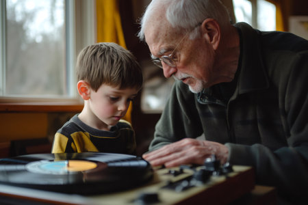 Grandfather and grandson listening to music on a vintage record player, sharing a special moment of connection and learning
