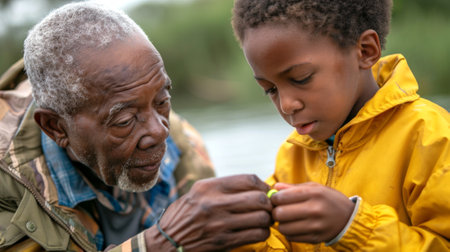 African American grandfather teaching young grandson to fish by the river. Concept of family bonding, outdoor activity, multigenerational learning, nature experience.