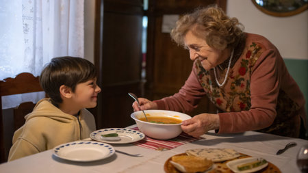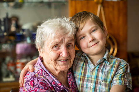 . Elderly woman and young boy are sharing a warm embrace in a cozy indoor setting, showcasing love and connection between generations