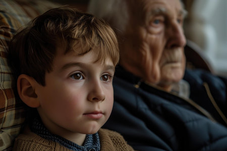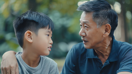 Peaceful and contemplative intergenerational bonding moment between a loving grandfather and his thoughtful grandson. Showcasing the deep emotional bond. Respect