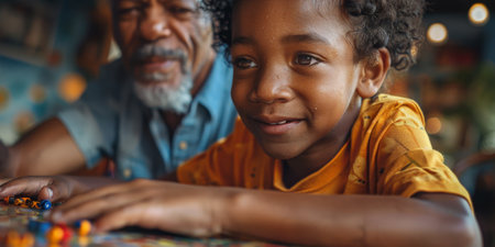 A heartwarming portrait depicting a senior man and young boy, demonstrating family connection against a dark background. A.I.