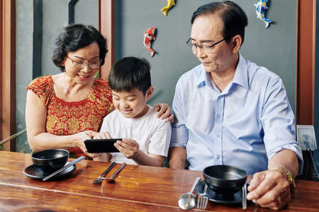 Happy Asian grandparents and grandchild sitting at cafe table and using mobile application on smartphone