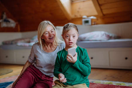 Boy with Down syndrome with his grandmother sitting on floor and using smartphone at home.
