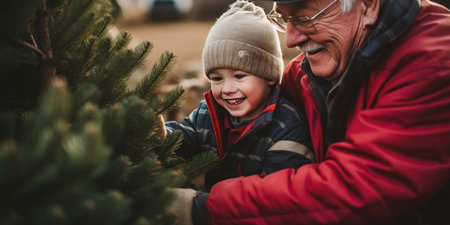 A moment of family togetherness, grandpa and grandson picking out a Christmas tree. AI generative.