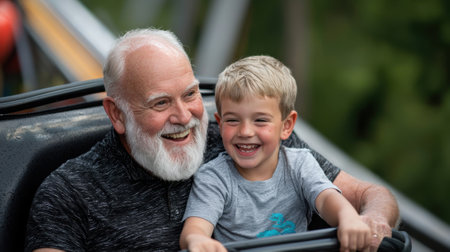 A man and a boy are riding a roller coaster. The man is smiling and the boy is laughing