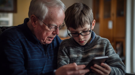 Grandfather and grandson share a special moment while exploring a smartphone indoors