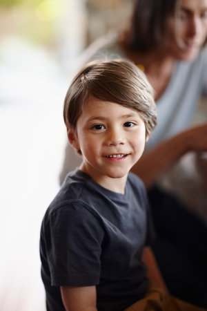 Cant wait till my friends get here. A young boy smiling happily as he sits at home.