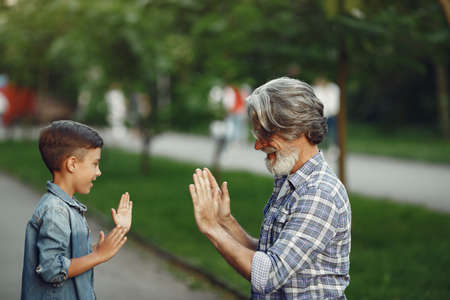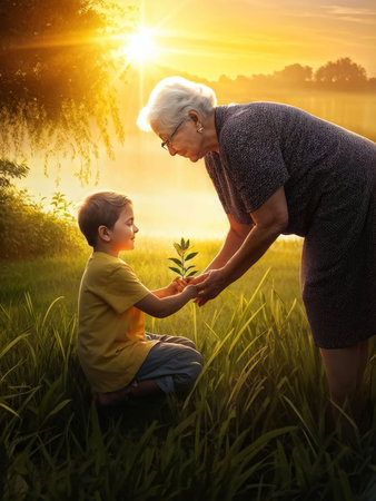 A heartwarming scene of an elderly grandmother holding hands with her young grandson while standing in a sunny park. They look at each other with affection, surrounded by large trees and green grass, symbolizing intergenerational love.
