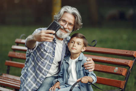 A grandfather and his grandson are sorting out a mobile phone together, exploring the technology together. AI generative