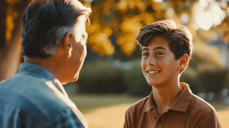 A happy teenage boy is engaged in conversation with his father on a sunny day.