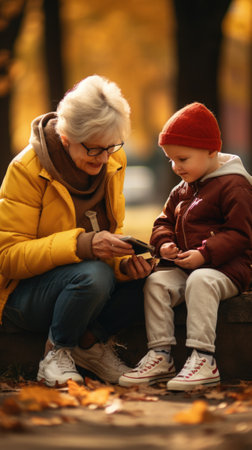 A young boy and an elderly woman are sitting together, with the boy taking a picture of the woman with his cell phone. Concept of warmth and connection between the two generations