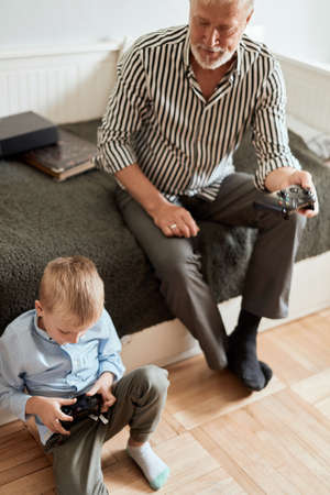 grandfather and grandson playing video game with joysticks in bed room while sitting on couch