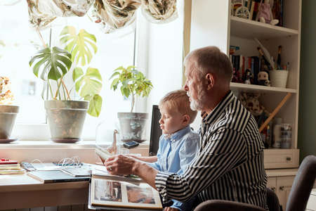 Grandfather and grandson on sofa at home. Grandpa and children watching old photos in album