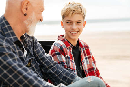 Smiling father and his son sitting in a car trunk on a back at the beach