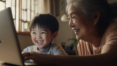 Joyful moments between a young Asian boy and his smiling grandmother while using a laptop in a cozy home environment