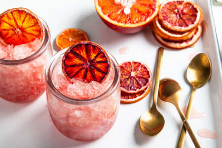 Homemade Italian Granita Dessert with blood orange, elderflower, rose wine in serving glasses on a white metal tray on a white table.