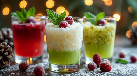 A selection of colorful festive drinks in glasses, featuring cranberries, mint, and frosted garnishes, with glowing lights in the background.