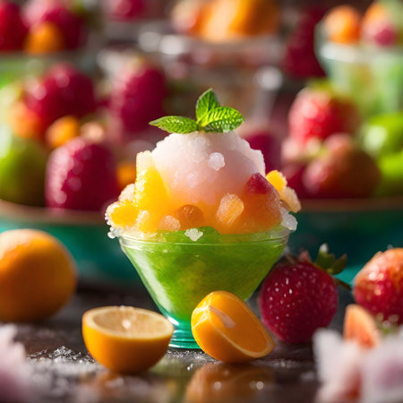 A vibrant snow dessert featuring a mix of fresh fruits like strawberry, kiwi, and raspberry, garnished with mint leaves, perfect for hot days.