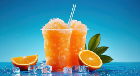 Two tall cups of orange slushy drinks with straws, surrounded by ice cubes and fresh orange slices against a blue background.