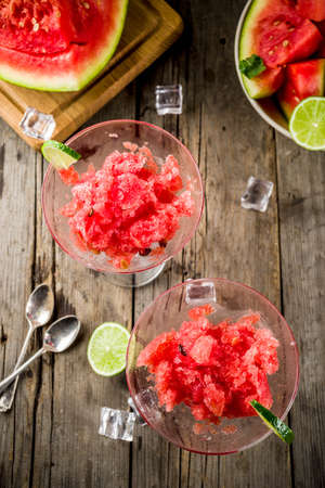 Sweet summer watermelon and lime granita with sliced watermelon and mint, on white marble background copy space