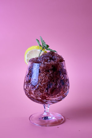 frozen red wine in a glass glass decorated with a slice of lemon and lemon leaves on a pink background. high quality photo