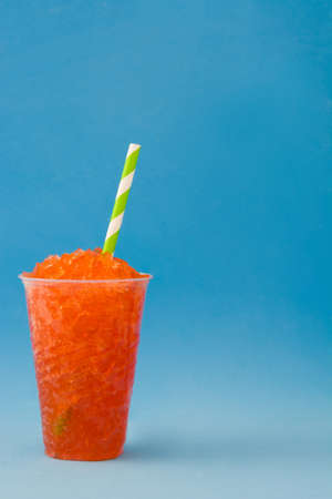 Colorful fruity slushie drink in plastic cup. Summer tropical frozen juice cocktail Slush
