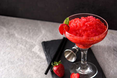 Red Slush drink isolated on black background. Glass of Shaved ice. Granizado with Fruit juice. Summer refreshment drink. Design element, space for text.
