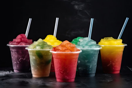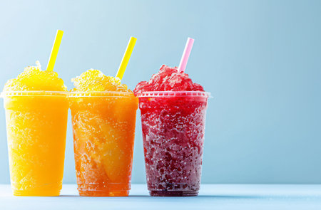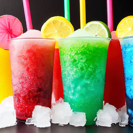Colorful slushies in clear cups, vibrant and refreshing drinks in a row