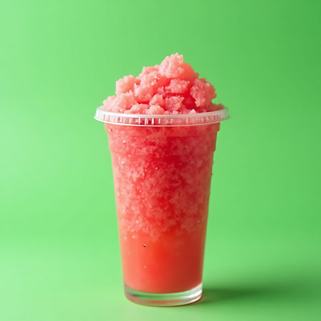 Vibrant pink slush drink sits in a transparent plastic cup against a bright green background, creating a refreshing, summery mood ideal for food and beverage promotions.