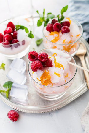 Almond milk and orange zest granita with fresh raspberries in glasses on a vintage metal tray with ice cubes and mint leaves