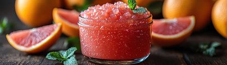 Grapefruit jam with peel closeup vibrant citrus tone rustic background early light